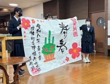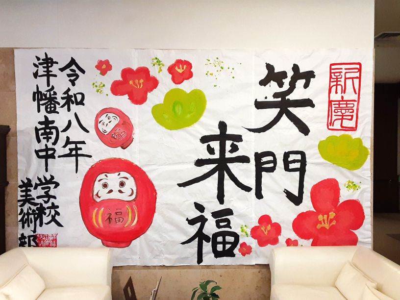 年末には津幡南中学校美術部の皆様がお正月の書道作品を持ってきてくださいました。お正月に模様替え、という事で玄関ホールのものを張り替えしました。