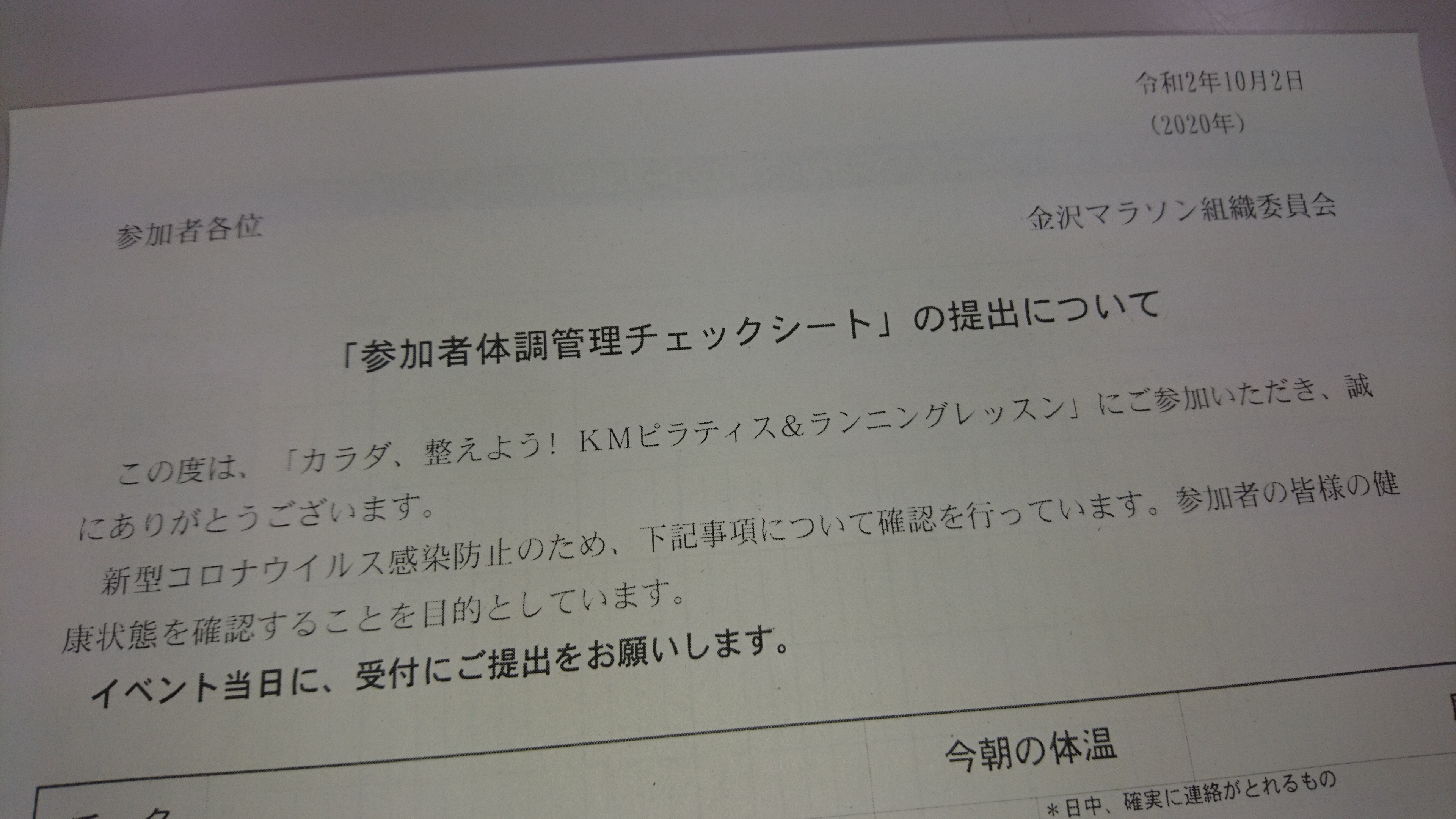 ※特に大会予定だった10月25日(日)に、金沢マラソンコースを集団で走行する行為は控えるようお願いします。