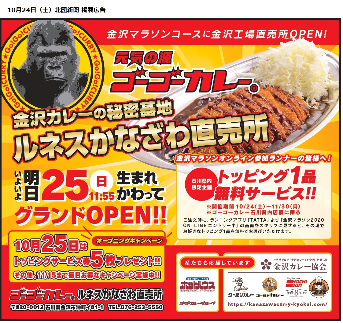 金沢カレー協会に加盟するゴーゴーカレーさんでは、現在、ご注文時にランニングアプリ「TATTA」より「金沢マラソン2020 ON-LINE エントリー中」の画面をスタッフに見せると、その場で お好きなトッピング1品を無料でいただけます!