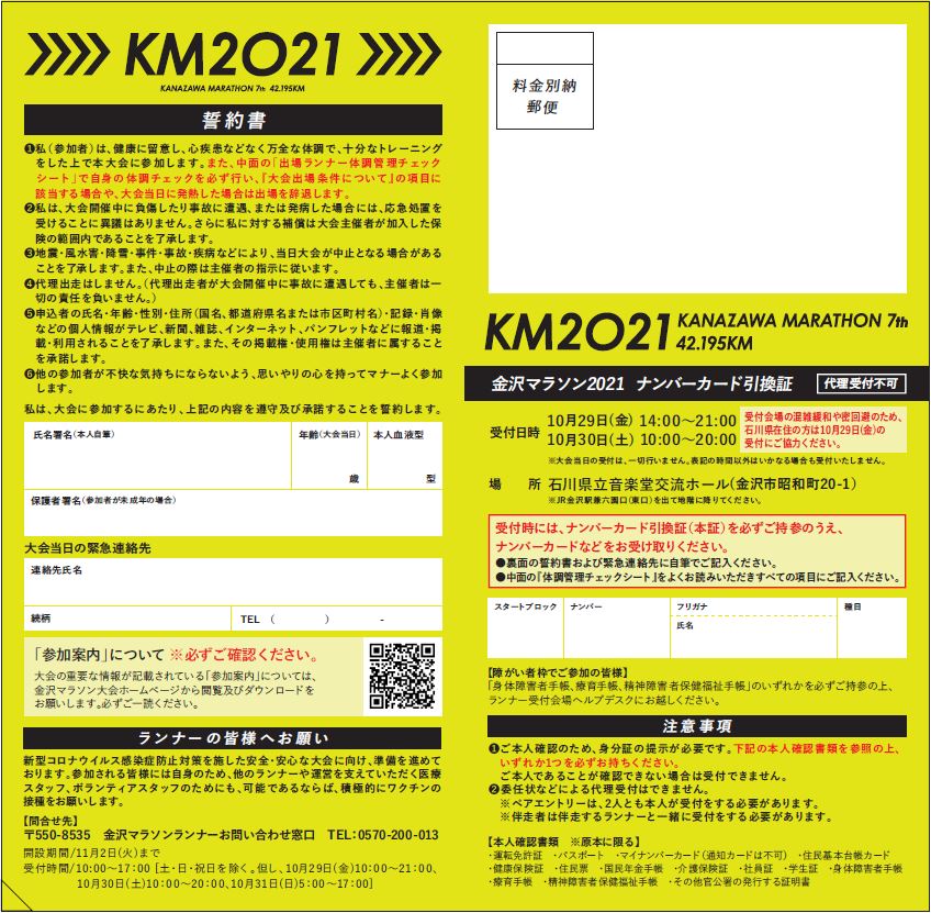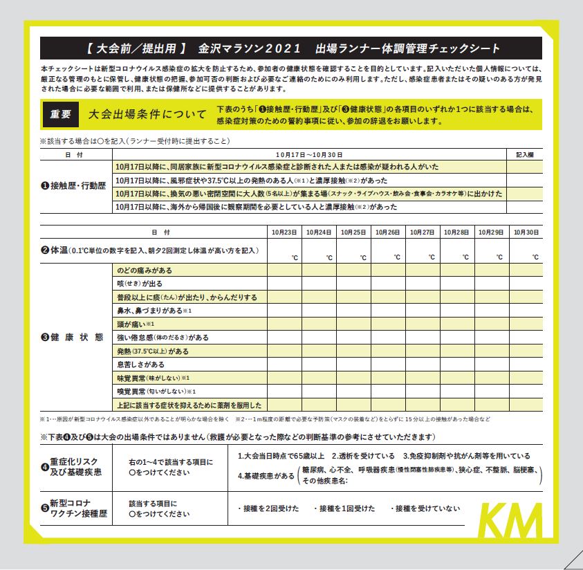 今回は新型コロナウイルス感染症防止対策のため、ナンバーカード引換証の中面の「出場ランナー体調管理チェックシート」に、大会2週間前からの健康状態等をご記入いただきます。ランナー受付時に確認しますので、必ずご記入の上、ご持参をお願いいたします。
