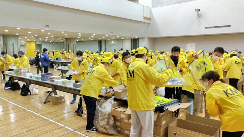 ランナー受付の準備が10月28日(木)から始まり、ボランティア約150名がランナーに配布する手荷物袋に大会プログラム等の封入を行っています。(石川県立音楽堂で実施)