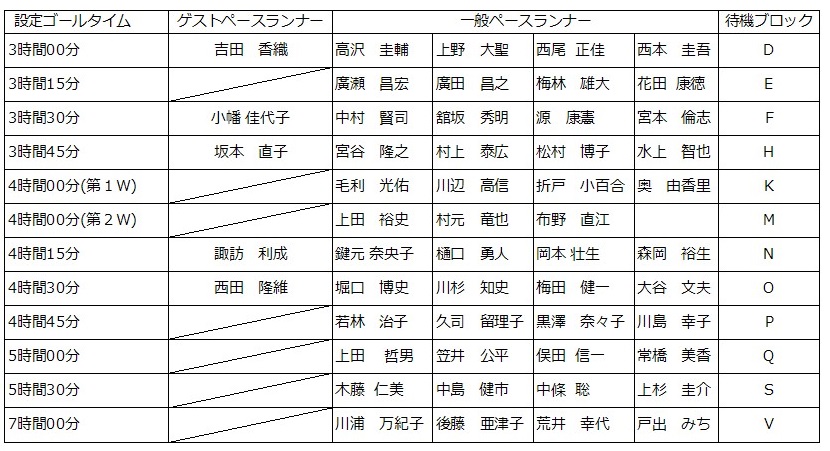 ゲストペースランナー及びペースランナーの設定時間と待機ブロックの一覧表を掲載します。