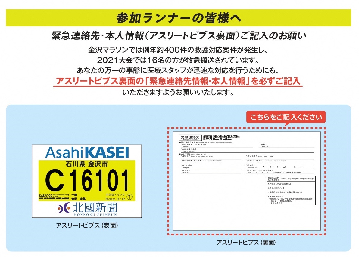 皆さまに万一の事態が起きた際、医療救護スタッフが迅速な対応を行うためにも、アスリートビブス裏面の「緊急連絡先情報・本人情報」を必ずご記入いただきますようお願いいたします。