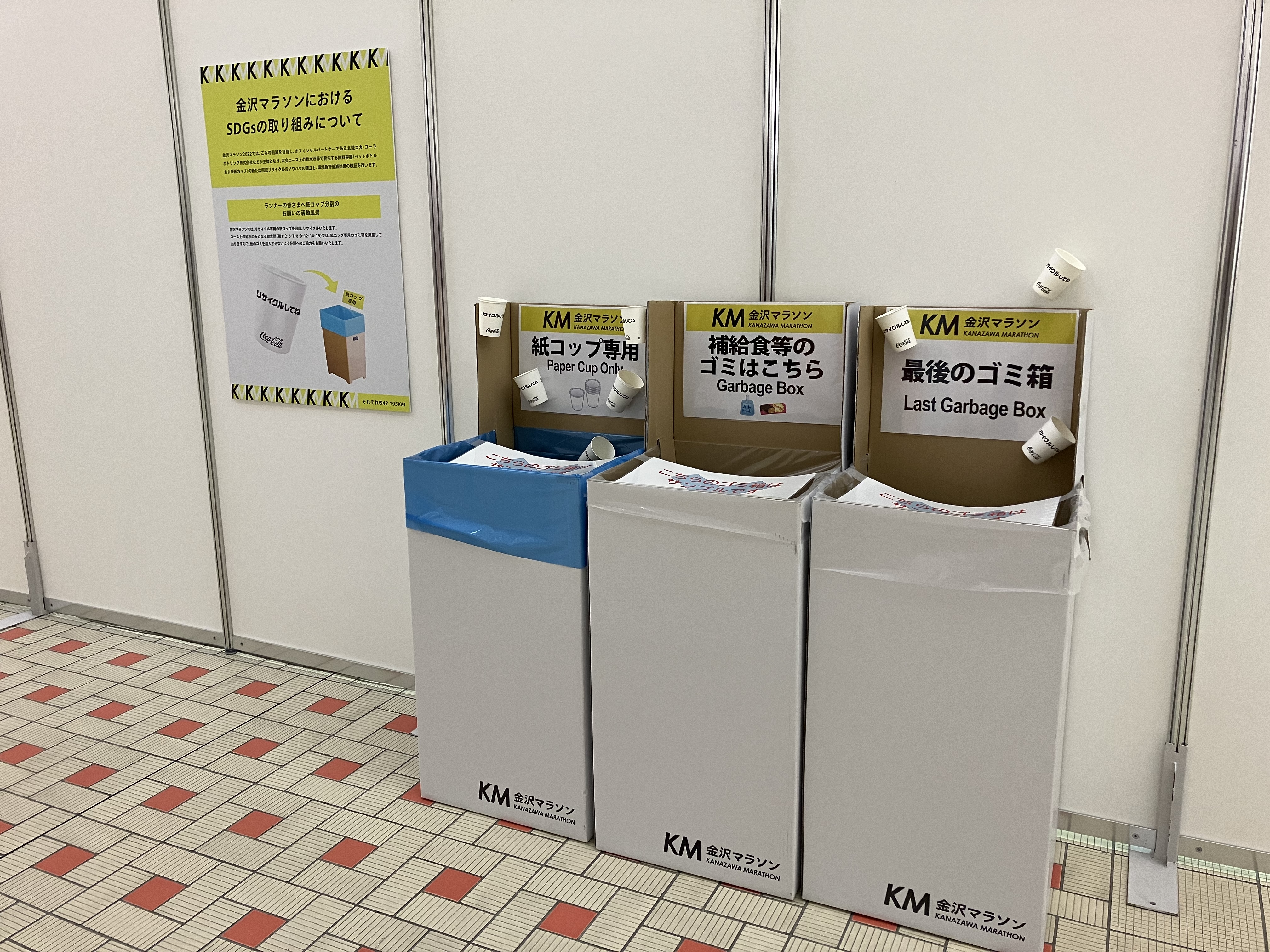 本日開幕の、金沢マラソンもてなしメッセで、給水所に設置するゴミ箱を展示しますので、ご確認ください。